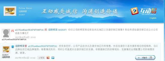 新浪财经讯 近日,有网友向涪陵榨菜询问公司产品有无在河北地区或雄安新区销售,有无考虑在雄安新区设立新公司或办事处?涪陵榨菜表示,公司产品在河北和雄安新区均有销售,并表示公司高度关注雄安新区的发展,将根据新区的政策规划、发展情况合理配置公司的销售资源。
