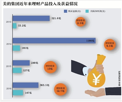 自2013年起,美的每年都会花费大额资金来投入到理财产品。新京报记者根据美的集团年度报告统计发现,美的集团在2013年至2016年4年间,累计买入2292亿元的银行理财产品,累计收益达37.85亿元。这占其过去四年累计归属净利润的8.75%。