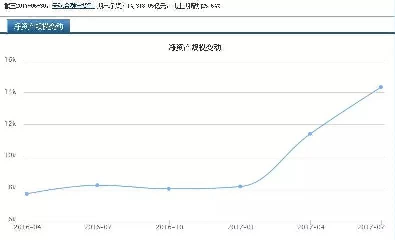 根据天天基金网的数据,截至6月30日,余额宝的期末净资产达到1.43万亿元,比去年年底的0.8万亿元,激增了近80%,环比2017年一季度末的1.14万亿元,增加了近3000亿元。