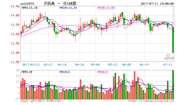 值得注意的是,7月11日午后,贝因美股价突然跳水,仅仅耗时8分钟便告跌停,最终收于11.97元/股。当日晚间,贝因美申请从7月12日起紧急停牌,表示正在筹划重大事项,涉及向控股股东贝因美集团有限公司等关联方出售重大资产,拟出售的资产属于乳制品上游行业。而到了7月14日,贝因美就宣布业绩大“变脸”。