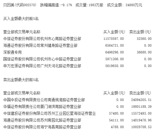 贝因美卖出前五名分别为中投证券南通姚港路证券营业部(卖出2409万元)、华福证券厦门湖滨南路证券营业部(卖出1980万元)、中信建投证券苏州工业园区星海街证券营业部(卖出1557万元)、海通证券苏州南园北路证券营业部(卖出1481万元)、中信证券海宁海昌南路证券营业部(卖出1002万元)。