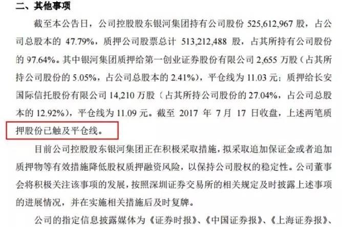 公司公告称,截至 2017 年 7 月 17 日收盘,上述两笔质押股份已触及平仓线。以目前每股股价10.76元计算,上述两笔质押已经跌破平仓线2.45%和2.98%,分别涉及市值2.86亿元和15.29亿元。