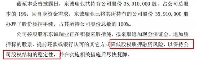科林环保今晚也发布公告称,截至公告披露日,东诚瑞业持有股权占公司总股本的 19%。因自身资金需求,东诚瑞业已将其所持有的公司股份 3591万股办理了股份质押手续,占其所持公司股份总数的 100%。