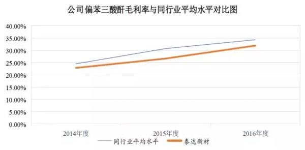 【泰达新材回应】公司综合毛利率处于上升趋势,2014 年、2015年和2016年主营业务综合毛利率分别为23.31%、25.28%和27.98%;其中偏苯三酸酐的销售毛利率分别为22.86%、26.67%和31.91%。