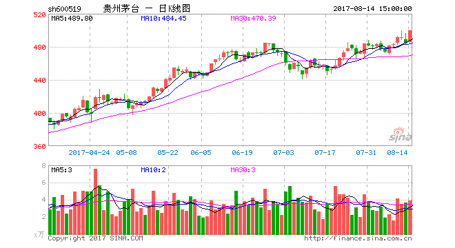 随着大盘企稳攀升,贵州茅台今日小幅高开后一路上扬,在资金的推动下,临近收盘,贵州茅台大幅拉升上涨,盘中最高价突破500元大关,涨逾3.30%,股价再创历史新高,总市值达6281亿元。8月10日盘中贵州茅台一度拉升涨至499.60元,离500元大关只差临门一脚。