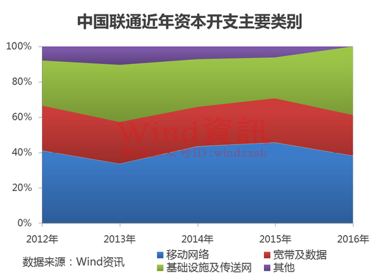 以中国联通为例,资本开支主要是用作移动网络、宽带及数据、基础设施及传送网等方面建设,各家运营商在用途方面也大同小异。从各项开支的占比来看,基本保持稳定,