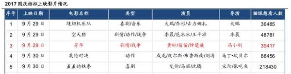 国信证券、中泰证券等专业研究团队则更看好光线旗下猫眼电影参投的《羞羞的铁拳》,认为其在国庆档获得头名的几率较大。