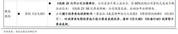 捷成股份(300182.SZ)是《空天猎》背后的投资方之一,其今年投资最为成功的电影莫过于《战狼2》。《战狼2》在中国内地狂揽近60亿元票房,除了保底发行方北京文化赚得盆满钵满外,捷成股份也将分得超过12亿元的收入,这将大大拉动其全年的业绩增长。