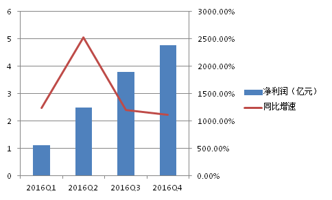 而进入2016年,六氟磷酸锂的产品价格尽管在年初回落至30万元/吨,但全年仅有1月份和2月份低于36万元/吨,其余月份均保持在36万元/吨之上,受此影响,公司去年各季度业绩全线暴涨,同比增速均在10倍以上。