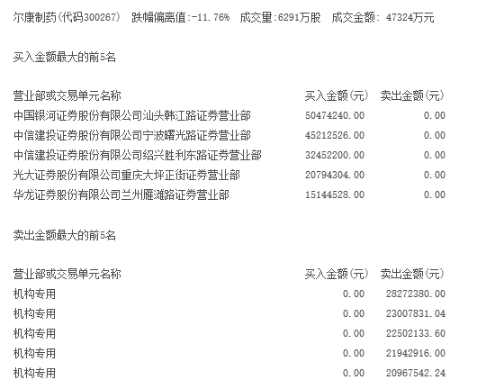 同时,尔康制药遭5家机构集中卖出。当日盘后龙虎榜显示,尔康制药卖出金额前5名全部都是机构席位,合计卖出1.17亿元。