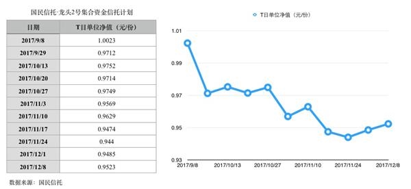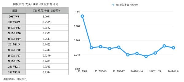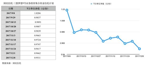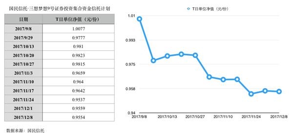 值得玩味的是,“龙头2号”和“龙头7号”的净值更新均始自2017年9月8日,“三想梦想7号”和“三想梦想9号”的净值从2011年8月18日开始更新,此后按周更新净值。最新一次净值更新为2017年12月8日,4只产品12月8日的净值均在0.95元附近。