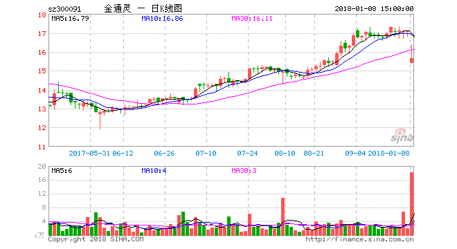 2018年1月8日,创业板挂牌公司金通灵(300091,SZ)复牌,股价以跌停价开盘,随后持续低迷,截至收盘股价报15.66元,跌幅为8.37%。