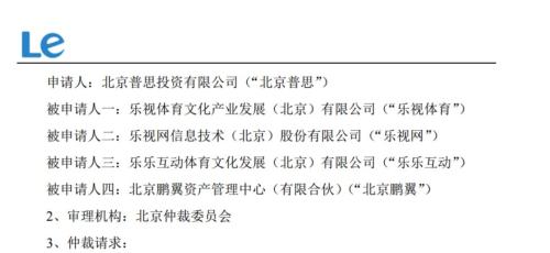 乐视网11月9日晚公告称,公司近期收到《仲裁申请书》,申请人为乐视体育其时新增投资者北京普思、厦门嘉御、天弘创新,向原股东申请仲裁金额共约2.4亿余元。
