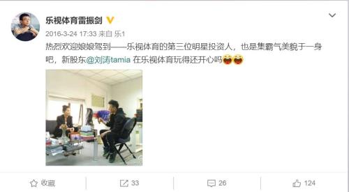 2016年乐视体育资金紧张时,演员刘涛爽快地投入5000万元。