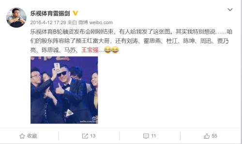 而乐视体育的B轮融资中,除了机构投资者外,还有11名明星投资人,包括刘涛、孙红雷、贾乃亮、周迅、王宝强等,总投资金额不到两亿,占股不到1%。