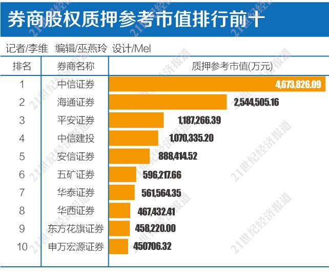 21世纪经济报道记者统计Wind数据发现,截至4月10日,中信证券、海通证券、中信建投(601066.SH)三家龙头券商分别以467.38亿元、254.45亿元和107.03亿元的大股东质押参考市值(未解押口径)分列该业务的第一、第二和第四名。