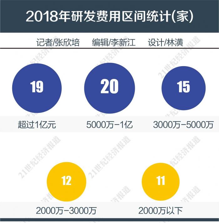 据21世纪经济报道记者统计,研发费用超过亿元的企业一共有19家,其中12家研发费用是在1亿-2亿。研发费用在5000万-1亿元的企业有20家,研发费用在3000万-5000万的有15家,11家企业研发费用在2000万之下。