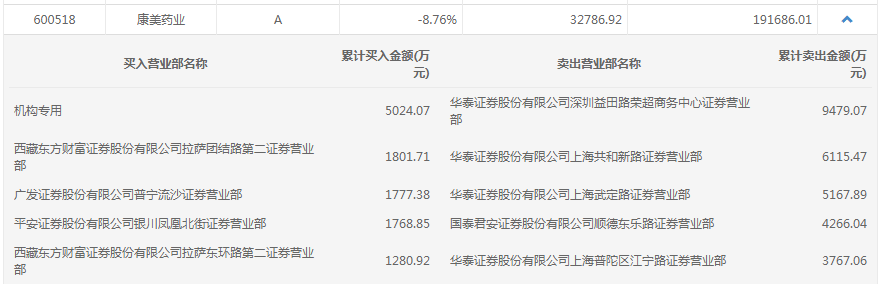 证券时报e公司讯,康美药业(600518)5月13日再度跌停,全天成交19亿元。该股盘后数据显示,一机构席位买入5024万元,位居买一席位;知名游资席位华泰证券深圳益田路荣超商务中心卖出9479万元,位居卖一席位。
