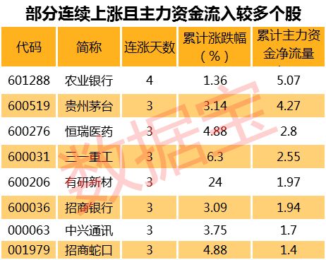 值得注意的是,409只连续上涨个股中,15只个股期间主力资金累计净流入超过亿元。其中,累计资金流入最多的为农业银行,主力资金累计流入5.07亿元。