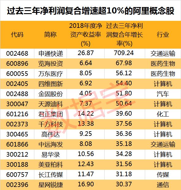 数据宝统计显示,从过去三年的业绩来看,上述55只阿里概念股中,有39家公司最近三年净利润复合增速大于0,占比近七成,其中29家超10%,占比超五成。