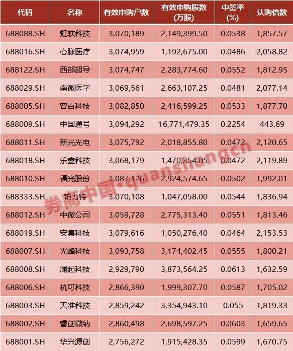 根据目前公布的18家企业中签率来看,平均中签率达到0.063%。其中,中国通号作为发行量最高的企业,其中签率也数倍于其他企业,高达0.2254%。在顶格申购的情况下,中签概率可达100%。而在剔除中国通号数据后,其余17家企业的平均中签率也在0.054%的水平。