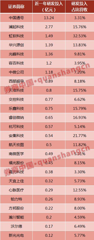 具体而言,在25家企业中,共有15家公司近一年研发投入在5000万元以上,占比六成;其中中国通号、澜起科技、虹软科技等7家公司研发投入过亿,占比近三成。其中,中国通号2018年研发投入高达13.24亿元,居于首位。