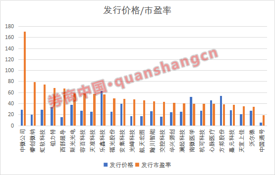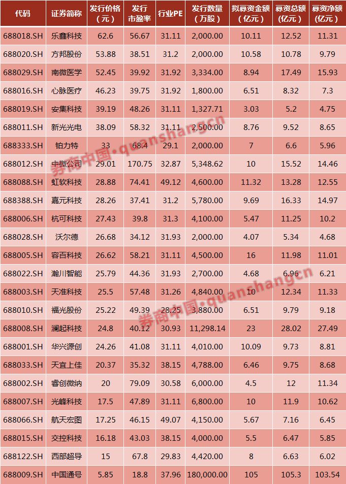 从发行价格上来看,乐鑫科技摘得发行价榜首,为62.6元/股,方邦股份和南微医学紧随其后,分别为53.88元/股和52.45元/股。发行价最低的为“巨无霸”企业中国通号,仅为5.85元/股。