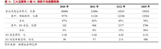三大运营商B端5G消息市场规模预测。数据来源:浙商证券