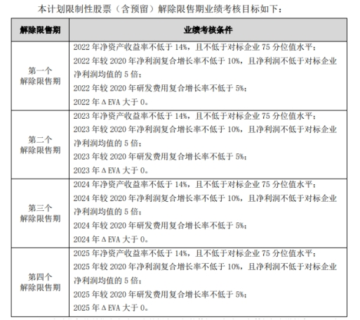 激励计划授予的限制性股票分四期进行解除限售,对应的公司业绩考核期为2022年-2025年四个会计年度,每个会计年度考核一次。同时,公司对照本次激励计划解锁考核指标,选择业务方向、资产规模、业绩水平方面可比性较强的上市公司共18家作为对标企业。