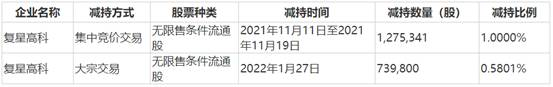 2022年1月27日,复星高科通过大宗交易的方式减持73.98万股,占中岩大地总股本比例为0.5801%。