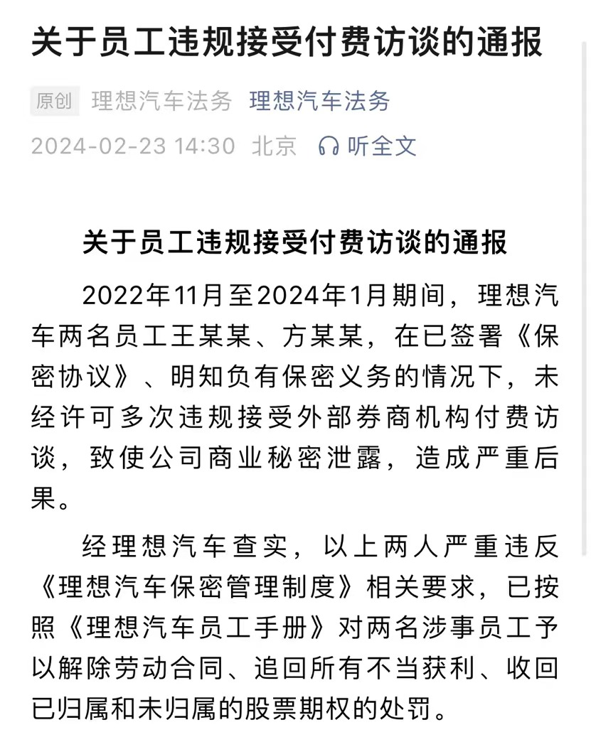 2月23日,理想汽车法务与知识产权部发布了一则关于员工违规接受付费访谈的通报。通报称,2022年11月至2024年1月期间,理想汽车两名员工王某某、方某某,在已签署《保密协议》、明知负有保密义务的情况下,未经许可多次违规接受外部券商机构付费访谈,致使公司商业秘密泄露,造成严重后果。