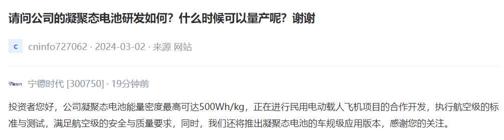 宁德时代:公司凝聚态电池正在进行民用电动载人飞机项目的合作开发