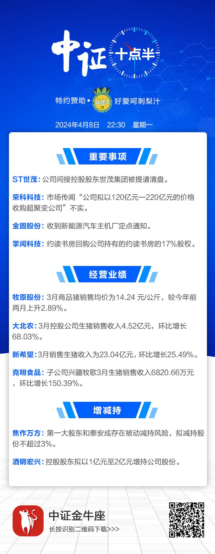 【中证十点半】ST世茂间接控股股东世茂集团被提请清盘;猪企三月业绩环比普遍提升