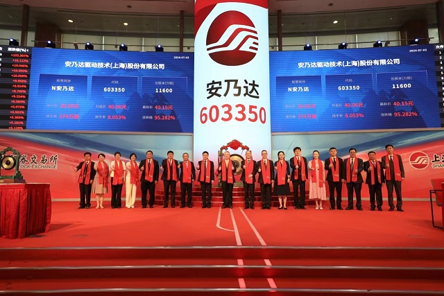 7月3日,安乃达驱动技术(上海)股份有限公司(简称“安乃达”)在上交所主板上市。当日,安乃达举行上市仪式并通过中国证券报·中证网播出。截至7月3日收盘,公司股价收于41.19元/股,上市首日涨幅达100.34%,总市值约为47.78亿元。