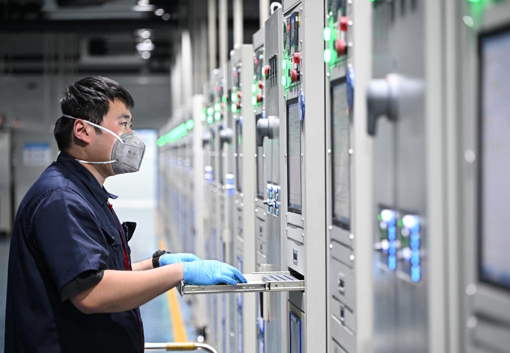 在位于济南市的某半导体科技有限公司生产车间内,工作人员在确认单晶生长参数。 新华社记者李贺 摄