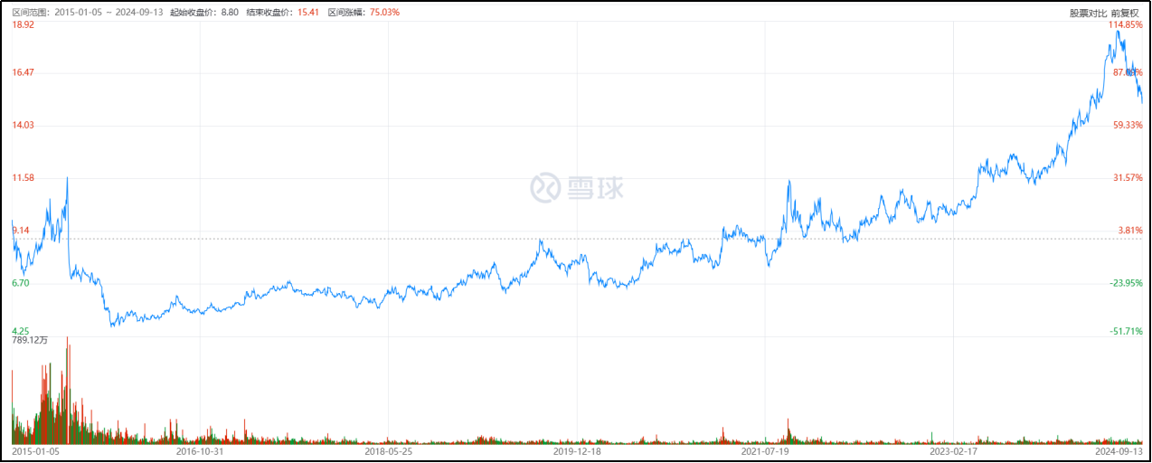 从2015年至今,国投电力股价由最低点的4.66元/股,逐渐上涨至如今的15.41元/股(截至2024年9月13日收盘),投资收益率达到231.40%。以9月13日收盘价计算,国投电力总市值达到1149亿元。
