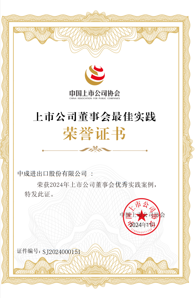 近日,中国成套设备进出口集团有限公司旗下企业中成股份(000151)荣获“2024上市公司董事会优秀实践案例”和“2024上市公司可持续发展优秀实践案例”,充分体现了专业机构和资本市场对中成股份的认可。