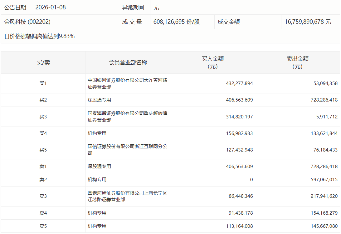 人民财讯1月8日电,金风科技今日涨停,成交额167.6亿元。盘后龙虎榜数据显示,深股通专用席位买入4.07亿元并卖出7.28亿元,1家机构专用席位净买入2336.11万元,3家机构专用席位净卖出6.92亿元。银河证券大连黄河路证券营业部净买入3.79亿元。