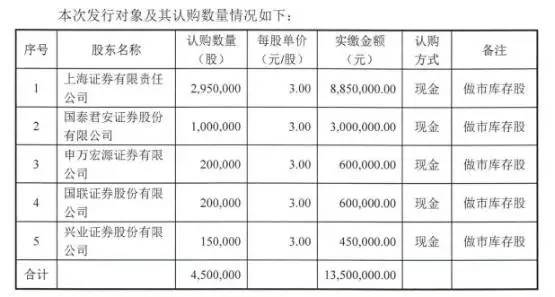 发行对象为5家证券公司,包括上海证券、国泰君安、申万宏源、国联证券、兴业证券。其中,国泰君安为上海证券控股股东,二者合计认购395万股,占此次发行450万股股份的87%。