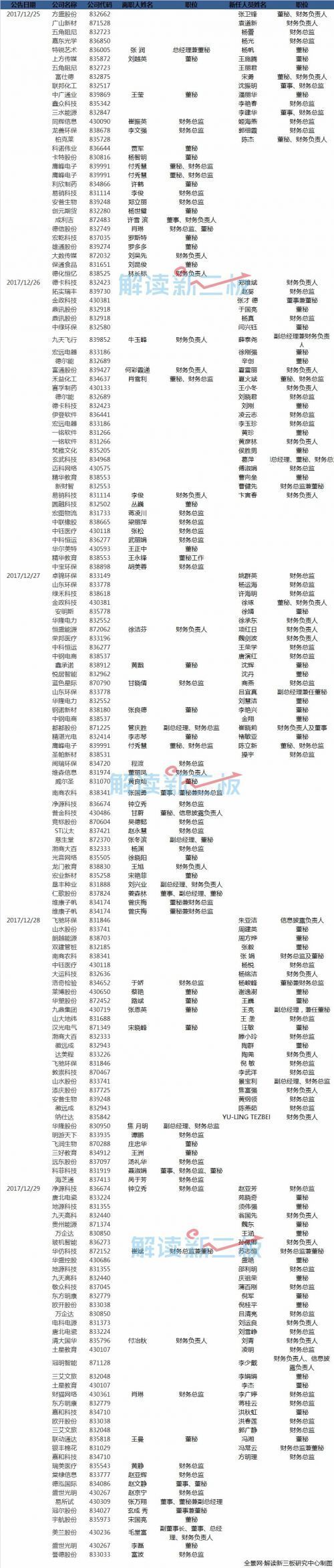 12月25日-12月29日,新三板共发布170份董事会秘书/信息披露负责人、财务总监/财务负责人变动公告,具体涉及136家挂牌公司。