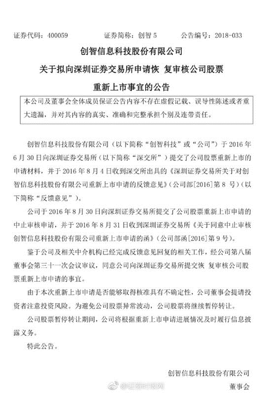 2016年7月8日,深交所披露已受理创智科技的重新上市申请。