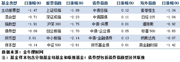 权益类基金:沪指失守3500,行业指数全线尽墨 昨日沪深股指低开后弱势震荡,沪综指失守3500点。截至收盘,上证综指报3470.07点,下跌1.89%;深证成指报12164.97点,下跌2.23%;创业板指数报2691.66点,下跌1.70%;中小板指数报8139.19点,下跌2.14%。申万一级行业指数全线尽墨,银行、计算机和交通运输指数跌幅较小,分别下跌0.59%、0.93%和1.12%;国防军工、建筑装饰和采掘指数跌幅较大,分别为3.50%、3.12%和2.85%。