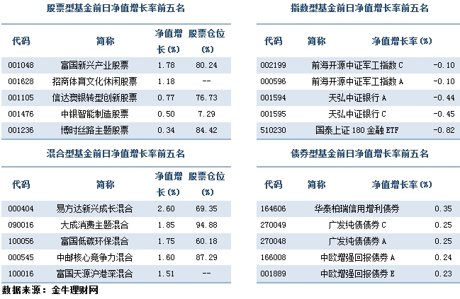 受此影响,金牛理财网偏股型基金指数下跌1.08%,主动偏股型基金指数下跌0.80%。指数股票型基金指数下跌1.91%。具体看来,跟踪军工、银行、金融行业指数的基金跌幅较小。前海开源中证军工指数、天弘中证银行分别下跌0.10%和0.44%。主动股混型基金中精于选股的小盘成长风格基金依旧涨幅居前。易方达新兴成长混合、大成消费主题混合领涨,涨幅分别为2.60%和1.85%。