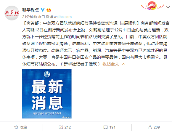 商务部新闻发言人高峰13日在例行新闻发布会上说,刘鹤副总理于12月11日应约与美方通话,双方就下一步经贸磋商工作的时间表和路线图交换了意见。目前,中美双方团队就磋商细节保持着密切沟通,进展顺利。中方欢迎美方来华开展磋商,也对赴美沟通持开放态度。高峰还表示,农产品、能源、汽车等是中美双方已达成共识的具体事项,大豆一直是中国进口美国农产品的重要品种,国内有巨大市场需求。具体细节将陆续公布。(新华社记者于佳欣)