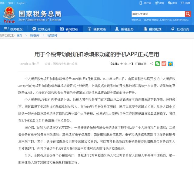 个人所得税专项附加扣除政策将于2019年1月1日起实施。2018年12月31日,由国家税务总局开发的个人所得税APP软件的专项附加扣除信息填报功能正式上线使用,上线仪式在该系统的开发基地浙江省杭州市举行。该系统的互联网WEB端、扣缴客户端和税务大厅端的专项附加扣除信息填报功能也同时向社会开放。