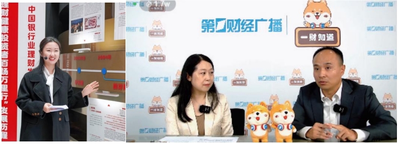 左图:讲解团讲解《中国银行业理财发展史》,右图:媒体合作投教—直播课程《理财课堂》直播