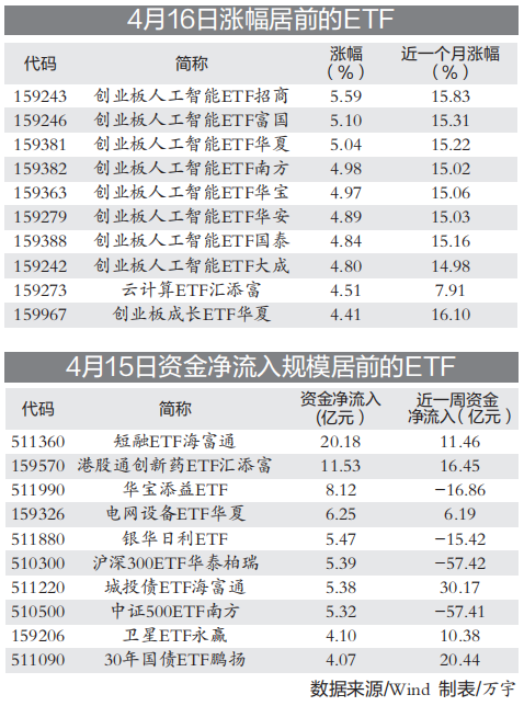 4月16日,创业板指创阶段新高,创业板人工智能ETF领涨。另外,云计算ETF汇添富、创业板成长ETF华夏等也有较大涨幅。