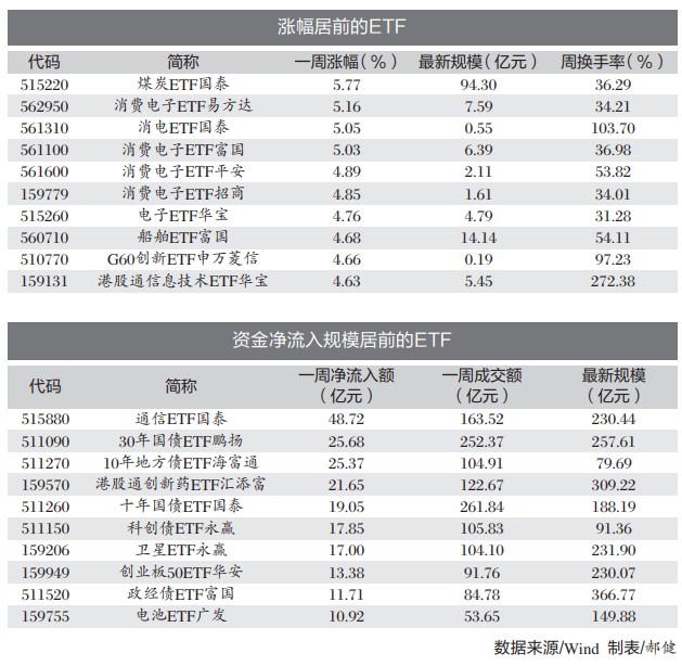 上周,煤炭、消费电子主题ETF表现亮眼。煤炭ETF国泰以5.77%的周涨幅领跑市场,最新规模为94.30亿元。多只消费电子主题ETF走强,易方达、国泰、富国、平安、招商等基金公司旗下产品的周涨幅均超4.8%。此外,电子ETF华宝,船舶ETF富国分别上涨4.76%,4.68%。