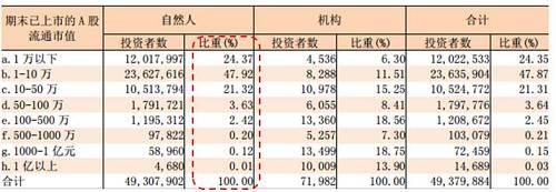据中登公司统计数据显示,截至去年12月,账户内流通市值在10万元以下的自然人账户占比达到72%+,而50万元以下的自然人账户占比则接近95%!级掌柜做了一个粗略的统计,在下表统计时点中,达到30W门槛要求的自然人账户占比可能还不到17%!