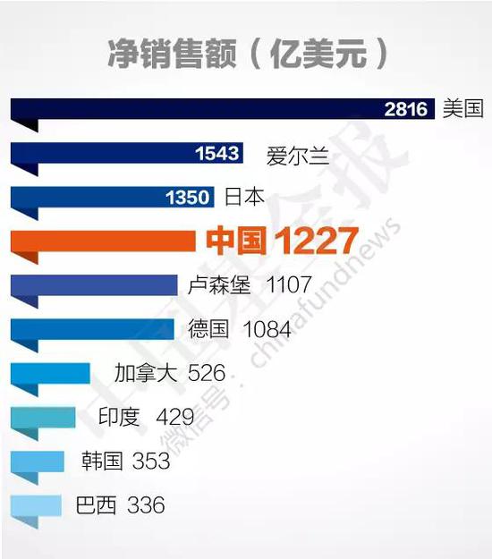 中国基金业另一个全球排名较高的数据是净销售额,2016年全年中国开放式基金净销售额为1227亿美元,高于德国和卢森堡的基金净销售额,排名全球第四,仅次于美国、爱尔兰和日本。